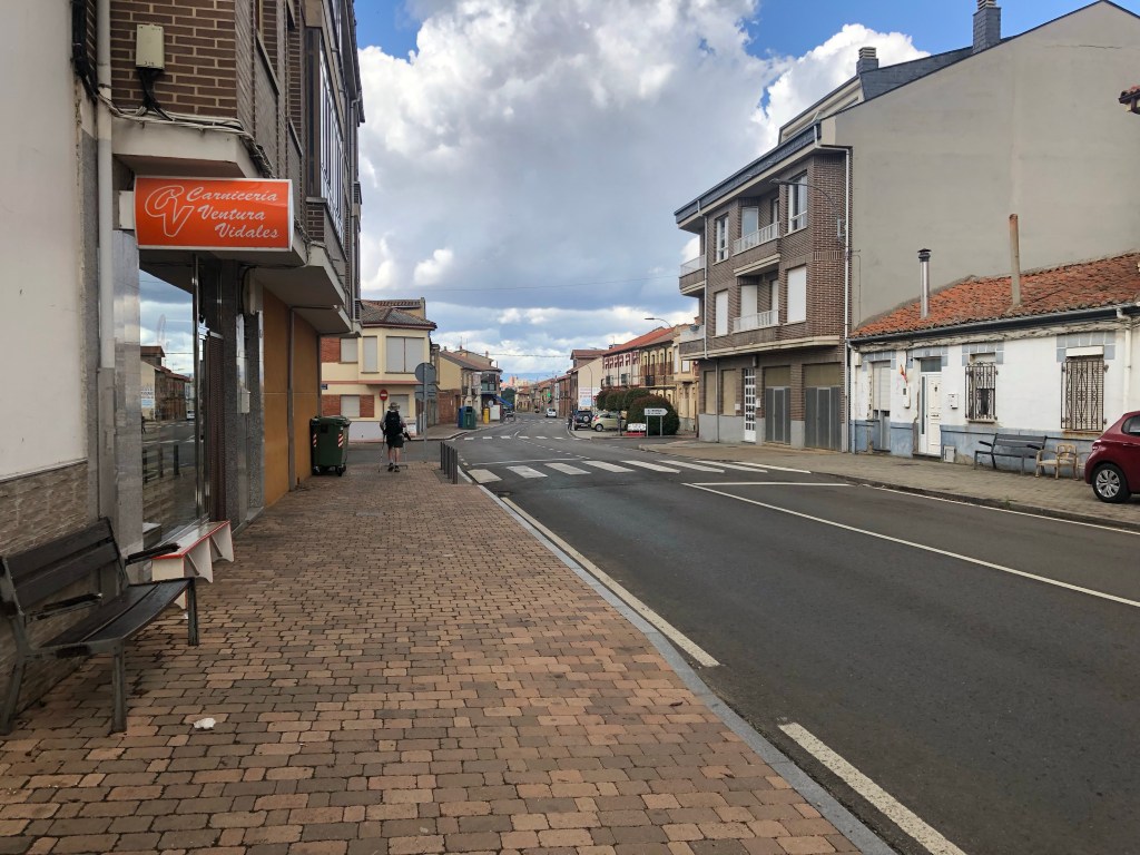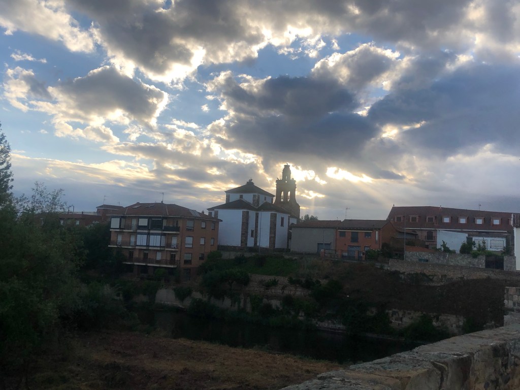 Leaving Hospital de Órbigo. Cloud cover, daylight breaking through. Our proprietor said, “It will rain by 11” and she was not wrong.