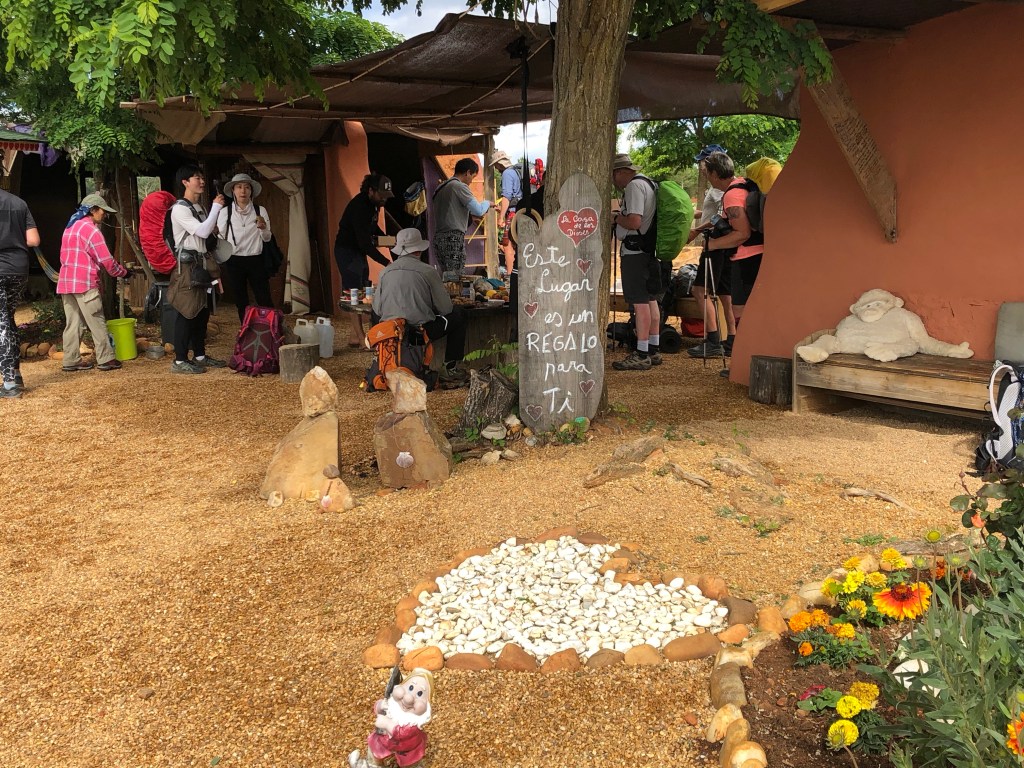 At our albergue! Ten beds in one little room, each with a locker and charging station. My bunk mate is Paul from Belgium (legs pictured). There’s one bathroom for the ten of us. 😬 We had a lovely communal meal prepared by Patricia, our Brazilian host and some great conversations between two Americans, one Brazilian (Claudia) and our Flemish roommates (Paul and Leva—I have to be spelling that wrong).