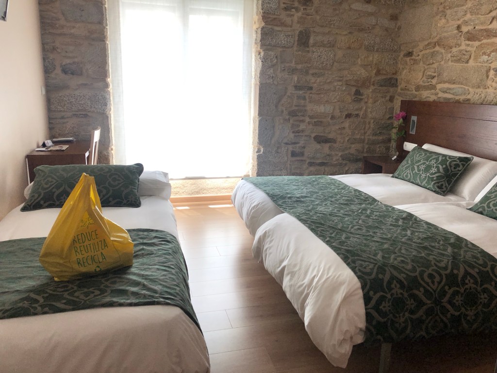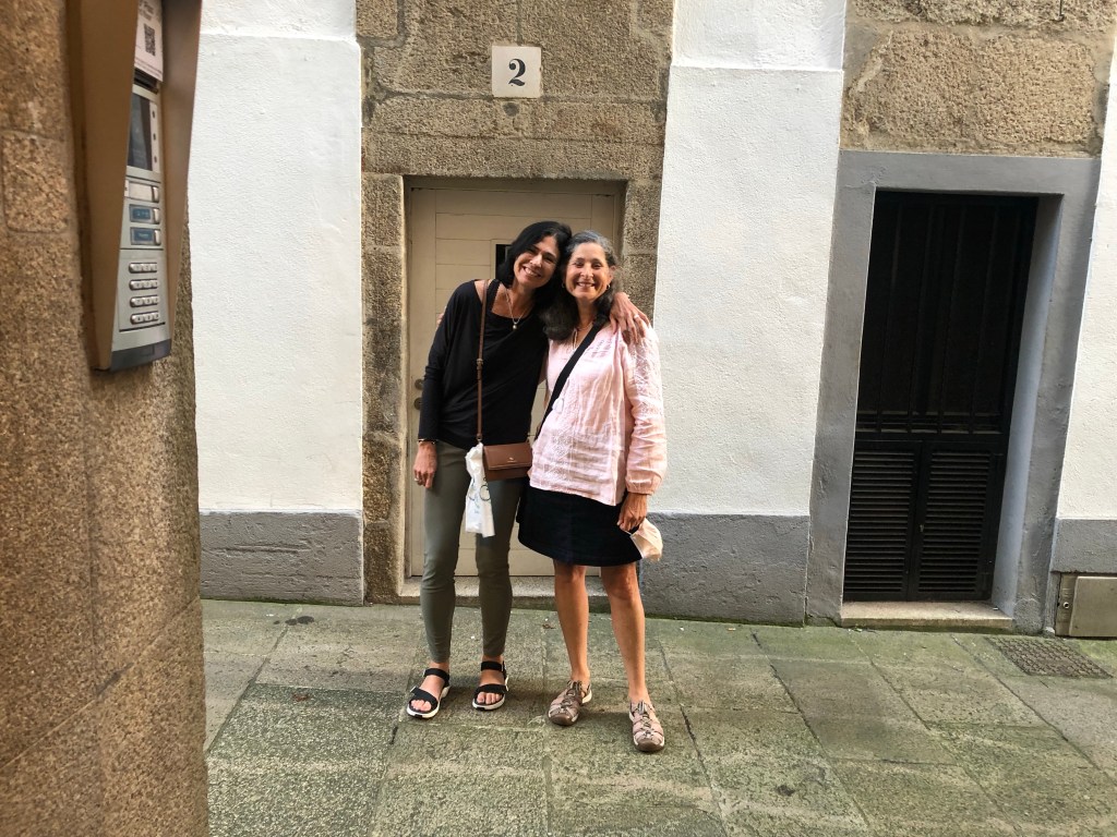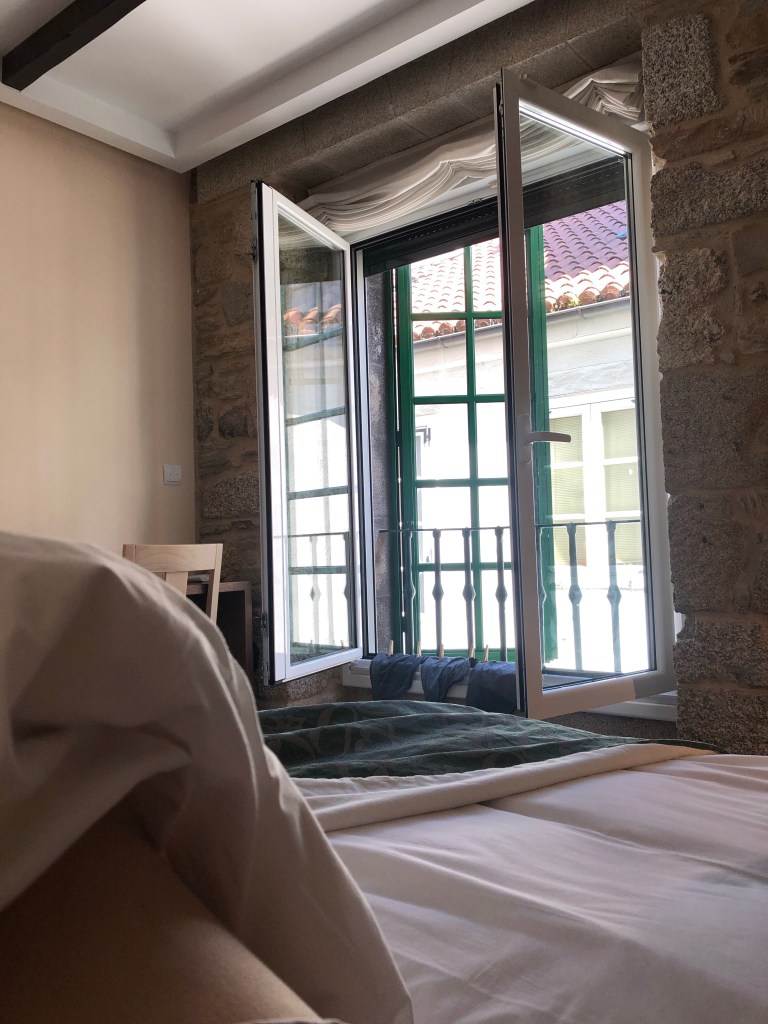 It’s 7:18 pm in Santiago, and the windows in my lovely private room are open, sounds of the street filtering up to me—Spanish, English, Italian, French, other languages I’m not sure I would be able to identify correctly. This morning, I remembered that the Janets are in Santiago (they skipped a few stages so they could be here for Sunday mass) and Will reached out. Janet 1 volunteered to pick up dinner for me tonight, and Janet 2, a nurse who recently had Covid, offered medical advice. This is wonderful, because Santiago is so busy, and I’m concerned about passing on Covid to anyone else. I’m feeling so lethargic—for the last hour, I’ve been contemplating getting the tweezer from my bag, but haven’t had the energy—but otherwise I’m okay. Friends have been texting and leaving encouraging comments, and I don’t feel so alone.