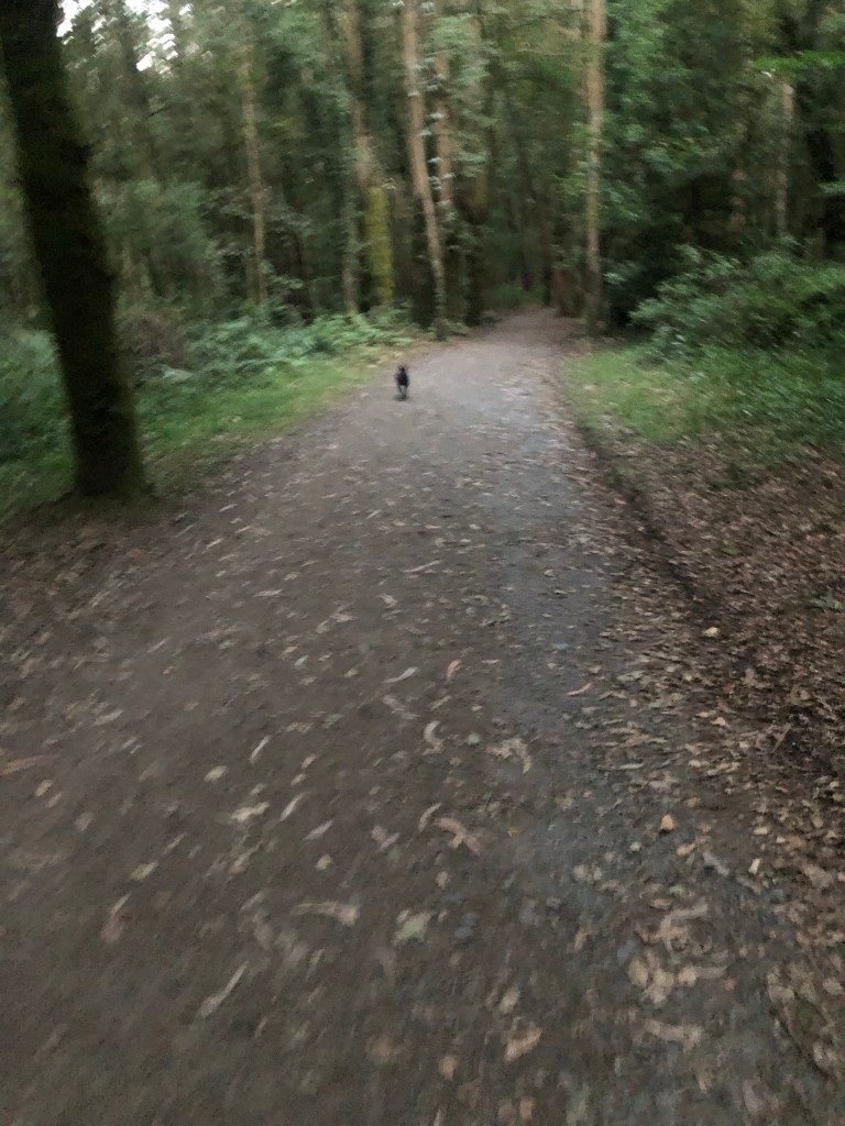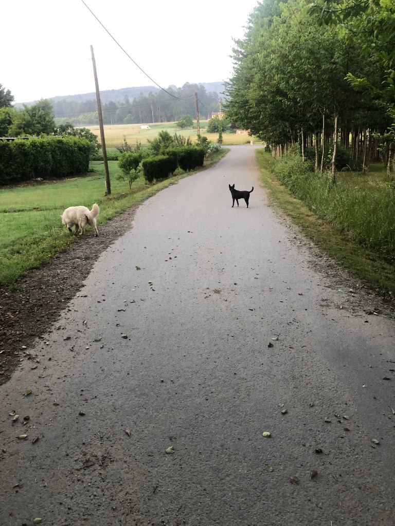 I started early in the morning, and spent a few kilometers by myself in the forest. A medium-sized black dog – about the size of Humphrey – joined me out of nowhere. He briskly trotted past me, looking back a couple times. I saw him again a couple hundred meters later, waiting for his larger friend, a white dog. They both walked with me for a half-kilometer or so, looking back a couple times. Eventually they stopped to poop and I didn’t.