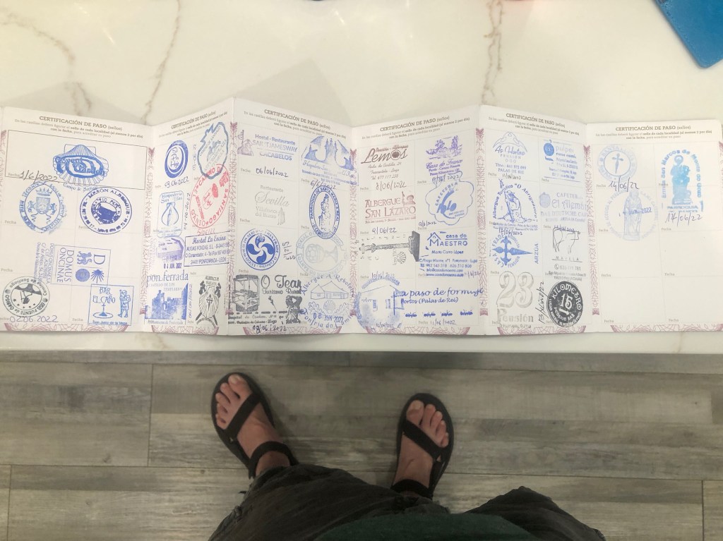 I brought back several Camino-related souvenirs. The most valuable are my credential (pictured above), my Compostela, my certificate of distance, and my rock from the O Cebreiro pilgrim’s mass and blessing. The rock and my scallop shell worn on my backpack are on our entertainment center; they’ll stay there unless we come up with a better place. The papers are probably going to be framed. Yeah, they’re of value to me. I wanted to do something different for our vacation, and this certainly qualified, but there’s an end game here as well, there’s a goal. And walking through that tunnel past the bagpiper and into the plaza to see Paula and the Cathedral was an amazing moment for me. Also, it’s freaking tough. As a member of a few Camino Facebook groups, nobody talks about how tough it is. In two weeks, I hit almost 450,000 steps. I left our FitBit charger in one of our rooms and we never got it back (it was found but lost in the horrible Spanish postal system) and it finally died on the final day of walking. My phone says I went 25,000 steps that day, so we’re using that. And also, nothing about Spain is flat.